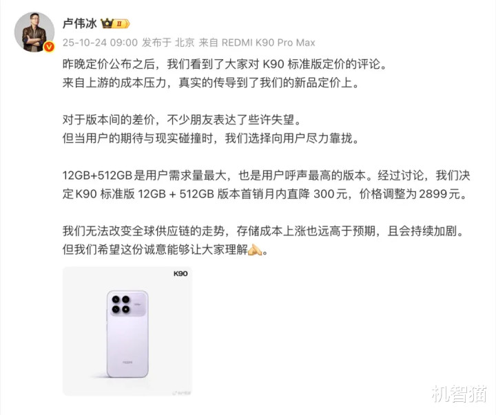 10月24日,也就是Redmi K90系列发布的第二天,小米集团卢伟冰发布了一条微博,对K90标准版的定价进行调整:12GB + 512GB 版本首销月内直降300元,价格调整为2899元。